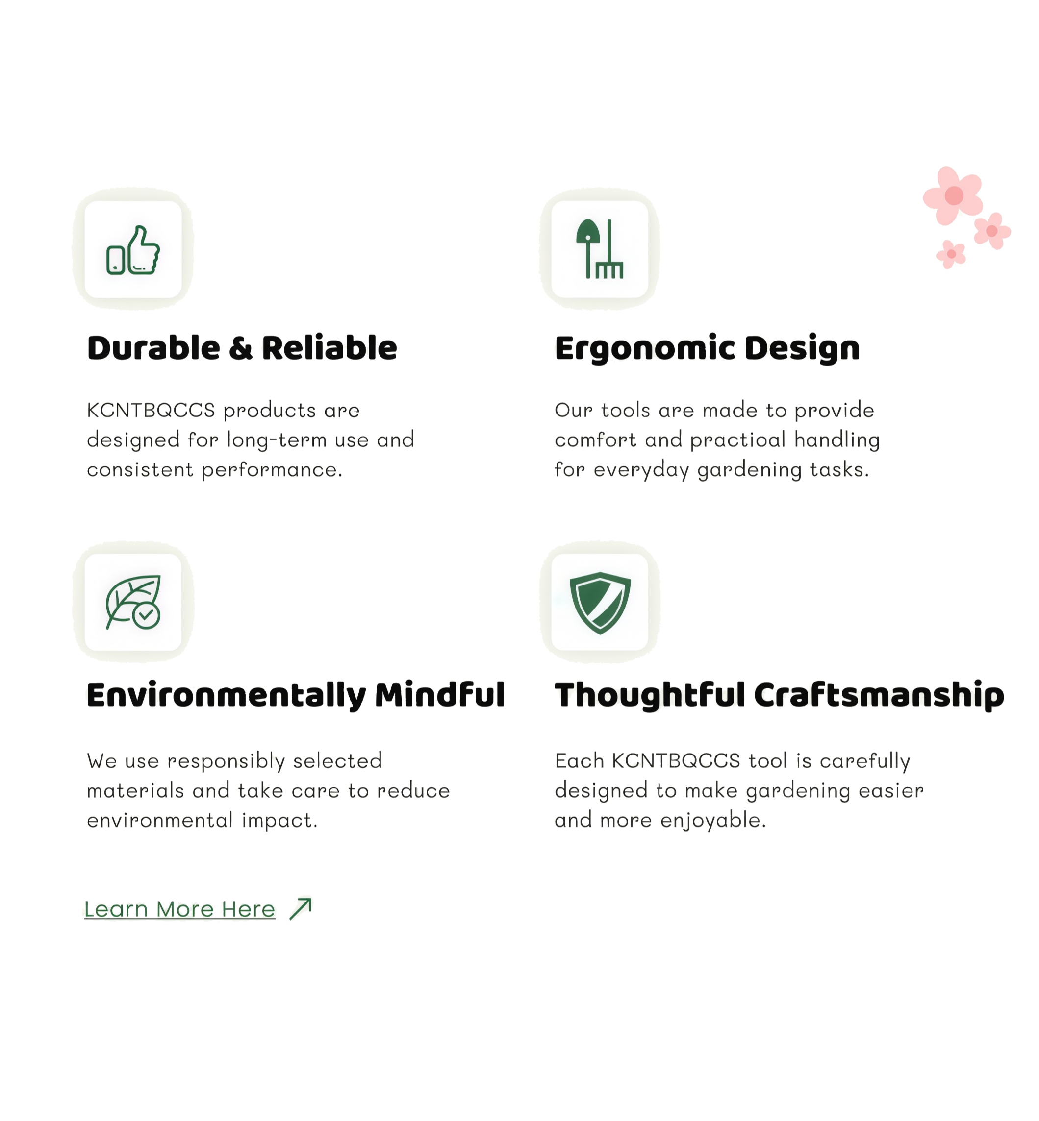 At KCNTBQCCS, we believe every garden is a place to cultivate joy, creativity, and connection. Our tools are designed to make gardening easier and more rewarding, helping you nurture plants and create moments of pride, relaxation, and satisfaction. Each product reflects our commitment to quality and sustainability, allowing you to grow a garden that embodies care, patience, and respect for the environment.